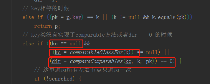 ab.第一个节点的key不相等的时候,判断这个节点类型是TreeNode的时候,通过putTreeVal方法将此节点转化树节点插入树中, 如果有key相等的树节点,覆盖value并返回旧的树节点,否则返回null,putTreeVal()方法有一个细节,key不仅通过了((pk = p.key) == k || (k != null && k.equals(pk)))判断是否相等,还判断key是否实现了Comparable比较方法,实现了还用这个方法判断key的大小。