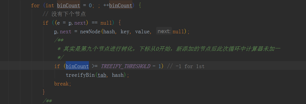 ac.第一个节点的key不相等的时候,这个节点类型是Node的时候,遍历此节点的下个节点,如果有key相等的节点则赋值给e,没有的话就插入到末尾,并且判断桶槽节点个数是否大于树化阀值8(TREEIFY_THRESHOLD),大于8(其实是第九个节点进行树化,下标从0开始,新添加的节点后此次循环中计算器未加一)进行树化treeifyBin方法,下图一。注意treeifyBin此方法中table的length小于64(MIN_TREEIFY_CAPACITY,下图二)的时候只是进行了resize(),没有进行树化,当大于等于64的时候才把node节点转化为TreeNode === 》TreeNode<K,V> p = replacementTreeNode(e, null),再进行treeify树化。