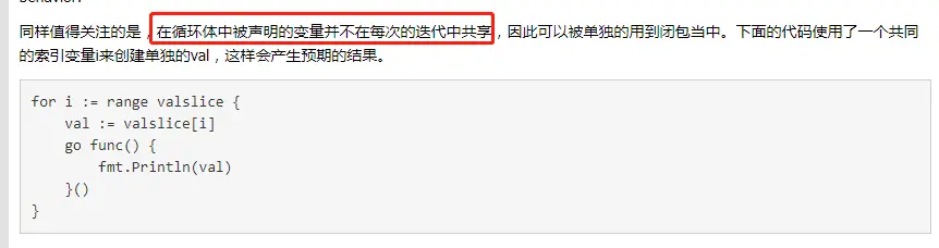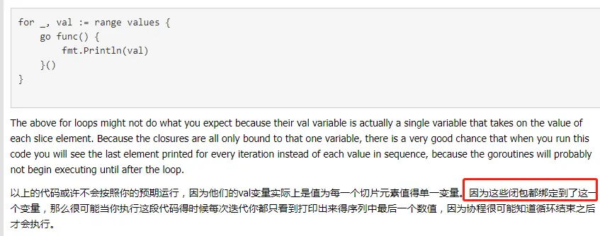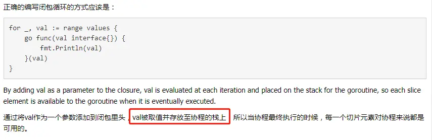 匿名函数中用到的外部变量,会将该变量的地址记录下来,等闭包中真正执行到该变量的时候才取它的值,for循环中,val的地址是固定的,每一个循环都将values里面的下一个元素放进这个地址,go协程完成初始化等工作需要时间,等真正执行里面的逻辑时for循环已经执行完,val里面是values最后一个元素,所以所有的协程获取到的值都是最后一个元素,不符合预期
