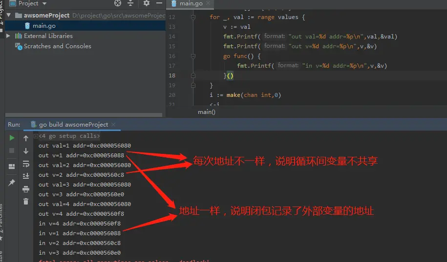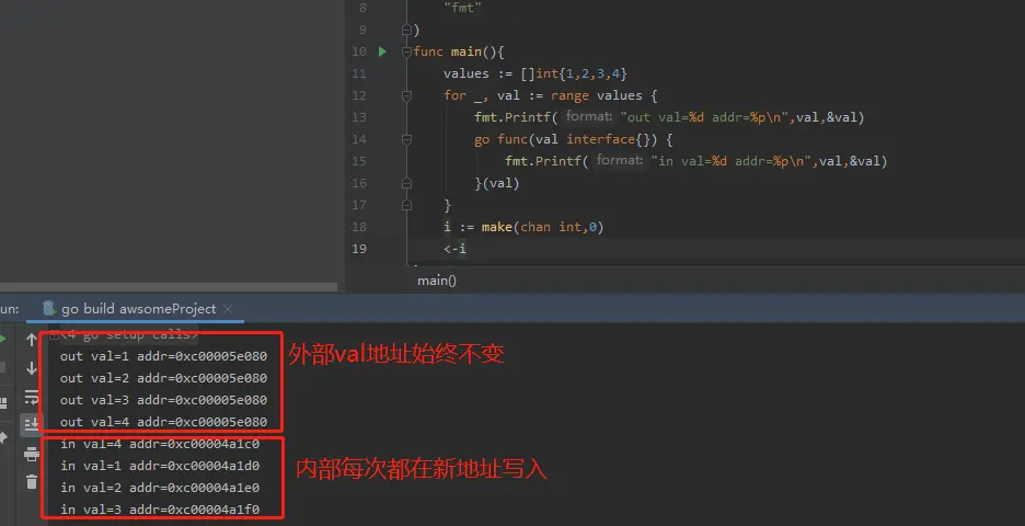 正确解决办法1,将变量通过匿名函数参数形式传进函数,相当于将外部变量复制一份给匿名函数,对每一个协程的入参val,地址都不同,且跟外部val也不同