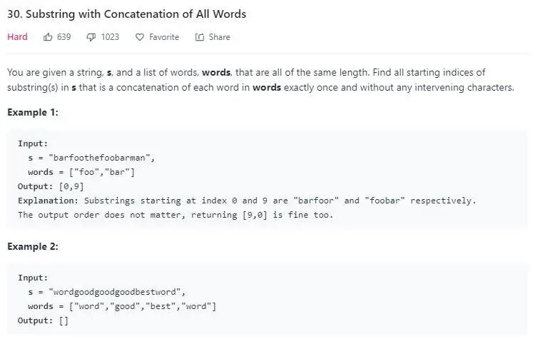 public List<Integer> findSubstring(String s, String[] words) { List<Integer> res = new ArrayList<Integer>(); int wordNum = words.length; if (wordNum == 0) { return res; } int wordLen = words[0].length(); HashMap<String, Integer> allWords = new HashMap<String, Integer>(); for (String w : words) { int value = allWords.getOrDefault(w, 0); allWords.put(w, value + 1); } //将所有移动分成 wordLen 类情况 for (int j = 0; j < wordLen; j++) { HashMap<String, Integer> hasWords = new HashMap<String, Integer>(); int num = 0; //记录当前 HashMap2(这里的 hasWords 变量)中有多少个单词 //每次移动一个单词长度 for (int i = j; i < s.length() - wordNum * wordLen + 1; i = i + wordLen) { boolean hasRemoved = false; //防止情况三移除后,情况一继续移除 while (num < wordNum) { String word = s.substring(i + num * wordLen, i + (num + 1) * wordLen); if (allWords.containsKey(word)) { int value = hasWords.getOrDefault(word, 0); hasWords.put(word, value + 1); //出现情况三,遇到了符合的单词,但是次数超了 if (hasWords.get(word) > allWords.get(word)) { // hasWords.put(word, value); hasRemoved = true; int removeNum = 0; //一直移除单词,直到次数符合了 while (hasWords.get(word) > allWords.get(word)) { String firstWord = s.substring(i + removeNum * wordLen, i + (removeNum + 1) * wordLen); int v = hasWords.get(firstWord); hasWords.put(firstWord, v - 1); removeNum++; } num = num - removeNum + 1; //加 1 是因为我们把当前单词加入到了 HashMap 2 中 i = i + (removeNum - 1) * wordLen; //这里依旧是考虑到了最外层的 for 循环,看情况二的解释 break; } //出现情况二,遇到了不匹配的单词,直接将 i 移动到该单词的后边(但其实这里 //只是移动到了出现问题单词的地方,因为最外层有 for 循环, i 还会移动一个单词 //然后刚好就移动到了单词后边) } else { hasWords.clear(); i = i + num * wordLen; num = 0; break; } num++; } if (num == wordNum) { res.add(i); } //出现情况一,子串完全匹配,我们将上一个子串的第一个单词从 HashMap2 中移除 if (num > 0 && !hasRemoved) { String firstWord = s.substring(i, i + wordLen); int v = hasWords.get(firstWord); hasWords.put(firstWord, v - 1); num = num - 1; } } } return res; }时间复杂度:算法中外层的两个for 循环的次数肯定是所有的子串,假设是 n。考虑一下,最极端的情况,每个子串的判断都进了 while 循环,wordNum 等于 m。对于解法一,因为每次都是从头判断,所以 while 循环循环了 m 次。但这里我们由于没有清空,所以每次只判断新加入的单词就可以了,只需判断一次,所以时间复杂度是 O(n)。