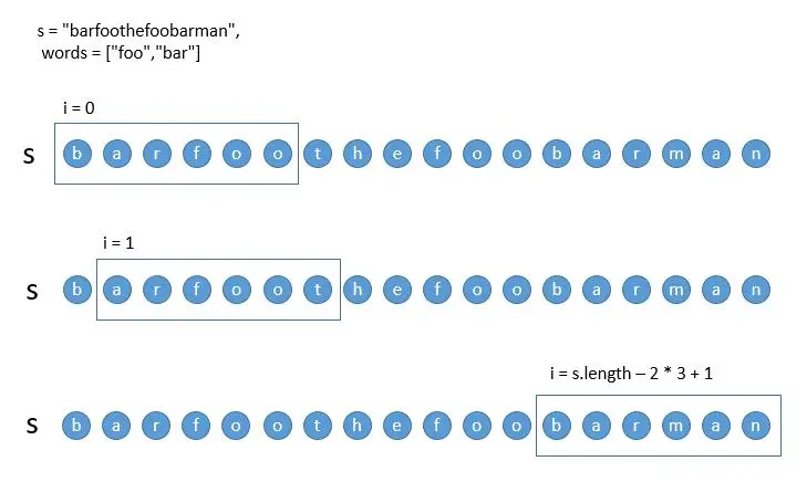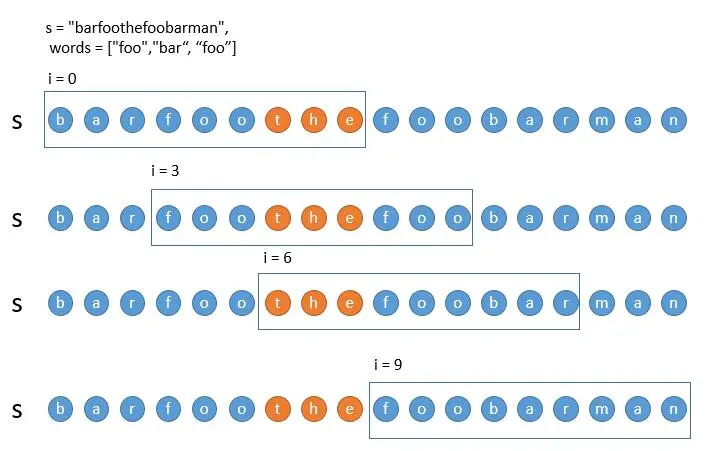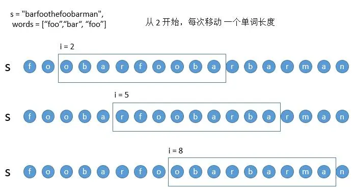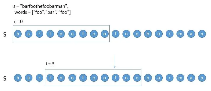 在解法一中,对于 i = 3 的子串,我们肯定是从第一个 foo 开始判断。但其实前两个 foo 都不用判断了 ,因为在判断上一个 i = 0 的子串的时候我们已经判断过了。所以解法一中的 HashMap2 每次并不需要清空从 0 开始,而是可以只移除之前 i = 0 子串的第一个单词 bar 即可,然后直接从箭头所指的 foo 开始就可以了。