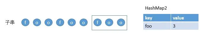 第三个单词也在 HashMap1 中,然后把 foo 存到 HashMap2 中,因为之前已经存过了,所以更新它的 value 为 3,然后继续比较此时 foo 的 value 和 HashMap1 中 foo 的 value,3 > 2,所以表明该字符串不符合。然后判断下个子串就好了。