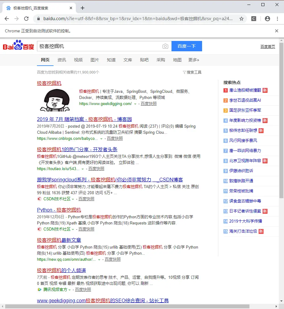运行以上代码,可以看到自动弹出来一个 Chrome 浏览器,并且上面标示了: Chrome 正受到自动软件的控制 。然后打开了百度,在输入框中输入了 “极客挖掘机” 进行搜索。