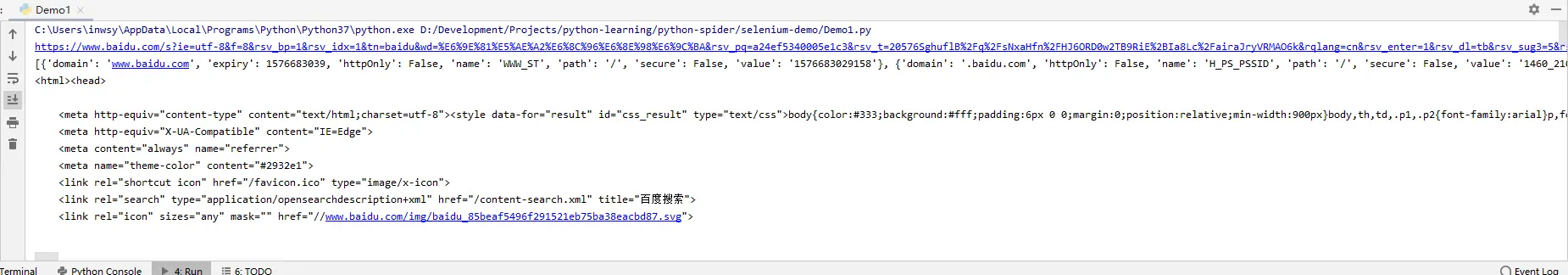 再搜索结果出来后控制台打印了当前的 URL 、 cookies 和网页的源代码。