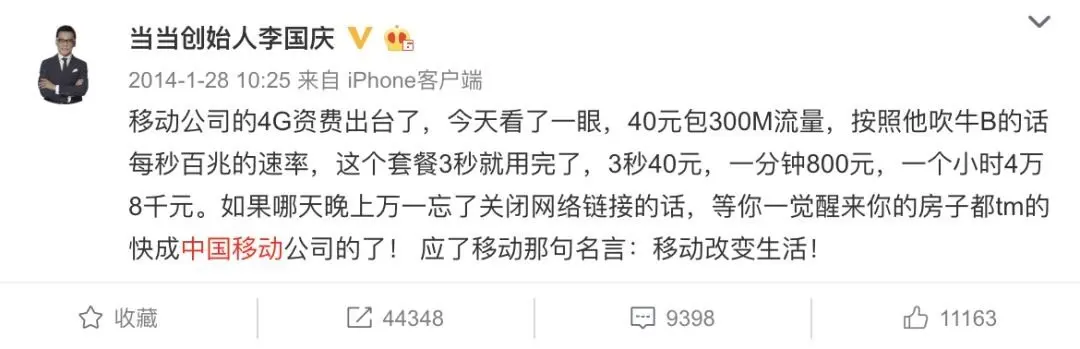 还有人更关心资费问题,就连前不久人设崩塌的当当创始人李国庆,14年也微博公开diss过。