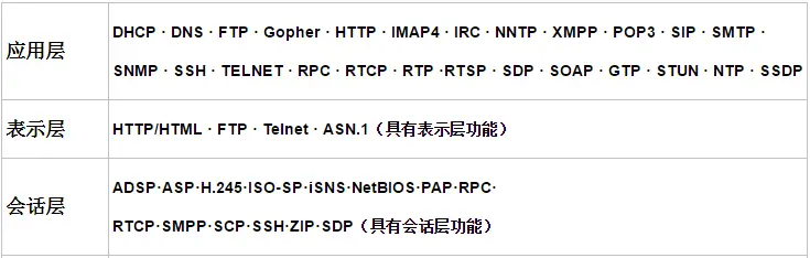 - 会话层:RPC,SQL,NFS,NetBIOS,names,AppleTalk,ASP,DECnet,SCP