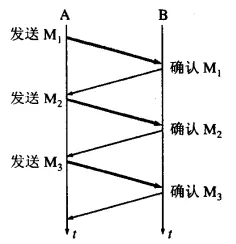 A发送报文分组M1,发送完毕就暂停发送,等待B的确认。B收到M1,就向A发送确认。A收到确认之后就在发送下一个分组M2。