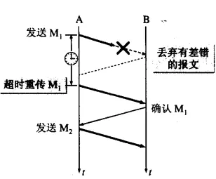如果A发送过程中出现差错或者B在接收M1是检查到出了差错(这里A在发送之前会保存分组的副本,再只有在收到确认之后才会清除副本),B在接收M1时检测到差错就丢弃M1,其他什么都不做。出现差错的情况,A只要超过一段时间没有收到确认,就任务出现差错,就会重新发送刚刚的分组,也就是超时重传。