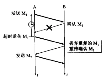 如果A向B发送了分组M1,B接收到M1之后,发送确认应答信息,但是由于网络问题,确认信息丢失,那么这个时间,A在超时重传的时间段内,没有收到B 的确认信息。A会重传M1分组。那么B会做两个动作,①B会丢弃到M1分组,不向上层交付 ,因为之前已经收到过M1分组。②向A发送确认信息。