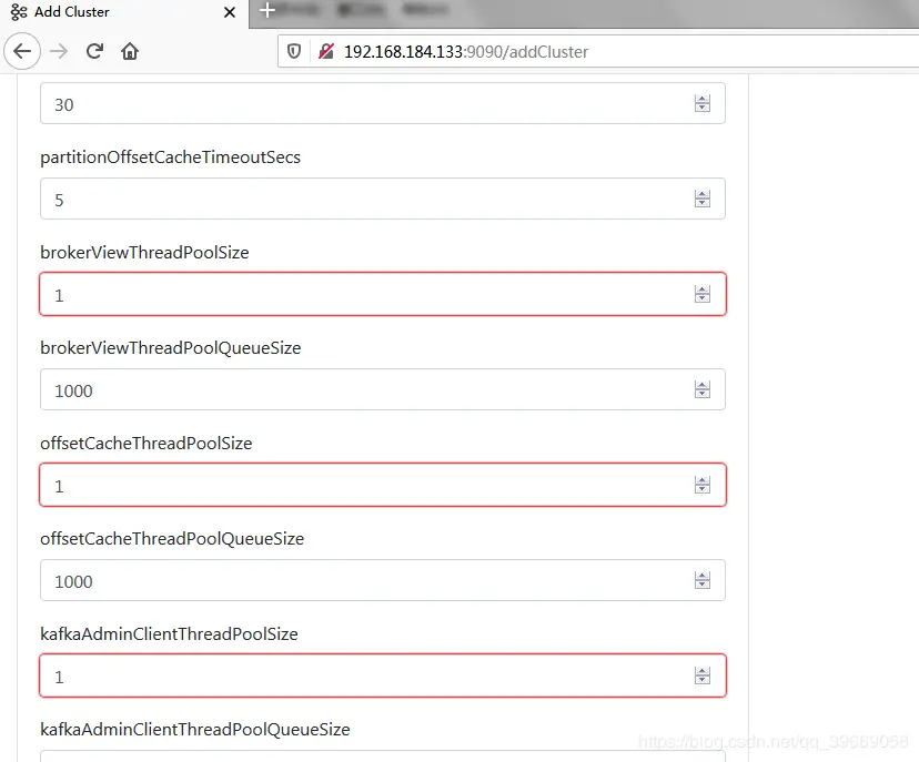 点击【Cluster】>【Add Cluster】打开如下添加集群配置界面:输入集群的名字(如KafkaCluster)和 Zookeeper 服务地址(如192.168.184.133:2181/kafka),选择最接近的Kafka版本