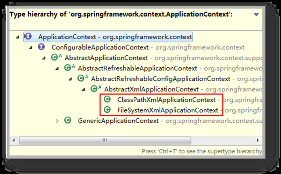 ApplicationContext用于加载Spring的配置文件,在程序中充当“容器”的角色。其实现类有两个。通过Ctrl +T查看: