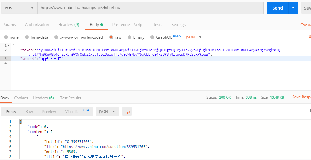 if 'token' in post_data and 'secret' in post_data and post_data['secret'] == '周萝卜真帅':