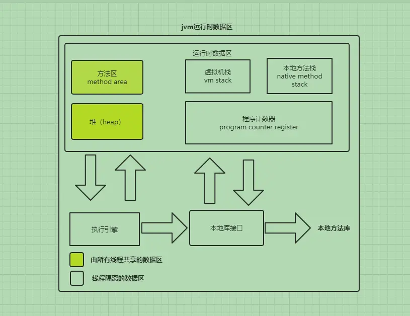 - 本地方法栈:和Java虚拟机栈的作用类似,区别为,Java虚拟机栈为执行Java方法服务,本地方法栈为执行本地方法(Native)服务,有的虚拟机,把本地方法栈和Java虚拟机栈合二为一,统称为虚拟机栈。