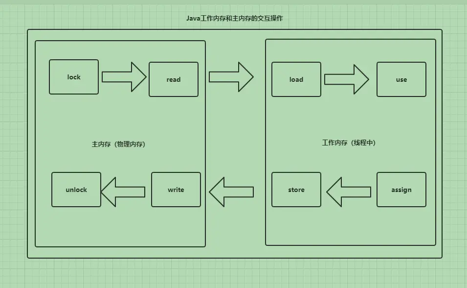 - write(写入):作用于主内存,把从工作内存中得到的变量值放入主内存的变量中。