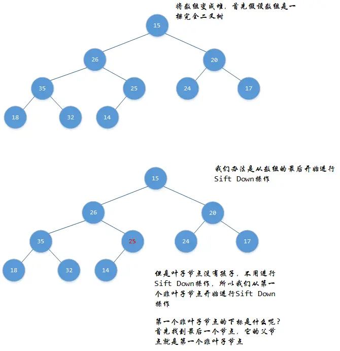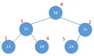 上面的序号表示的是在数组中的下标,我们发现如果父节点的下标为i,那么左孩子的下标就为2i + 1,右孩子的下标为2i + 2,所以可以很快的根据父节点的下标得到左右孩子的下标,如果知道左右孩子的下标i,那么(i - 1)/2就可以得到父节点的下标(整数除法,小数部分会被舍去)。这个结论可以使用数学归纳法进行证明,但不是这里的重点,所以不多做阐述。
