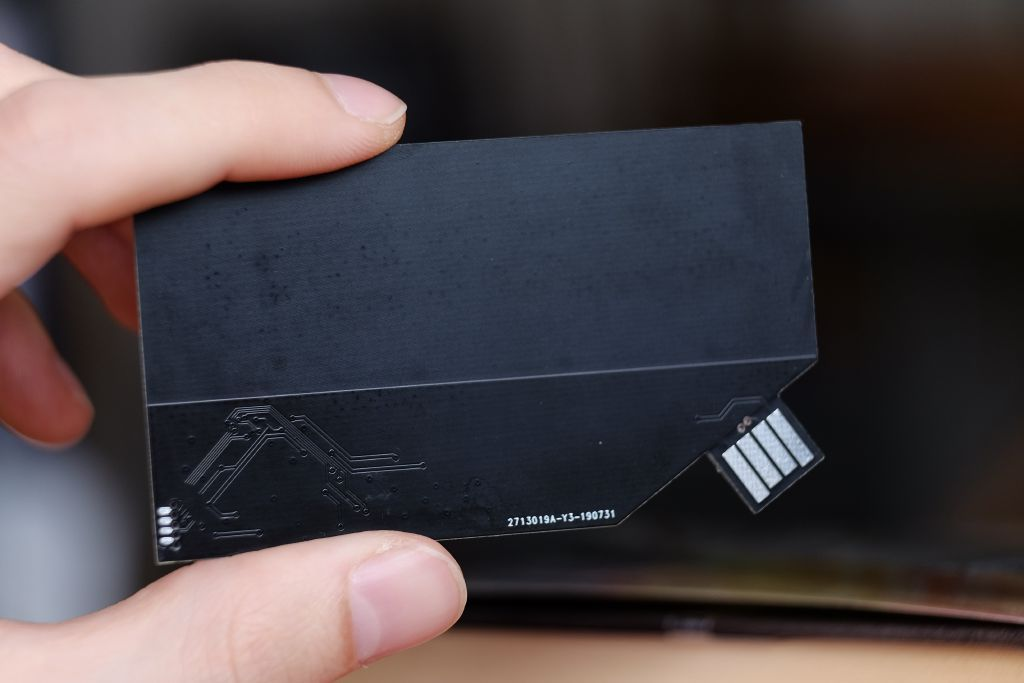 所以如何让它跑起来呢?名片的左下角是一个 USB 接口,如果你把它插入一台计算机,它将在
