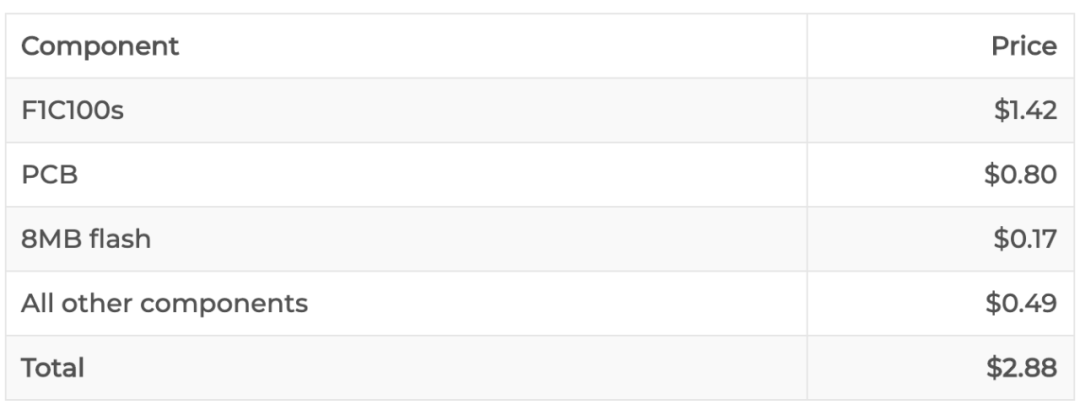 处理器的选择是最重要的部分,它会控制成本并确定整个项目是可行的。在一系列调研后,George 选择了 F1C100s,它是 Allwinner 出品的一块贼便宜的芯片,它在成本优化上下足了功夫。这块芯片集成了 RAM 与 CPU,在功能上至少已经满足要求了。