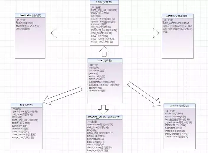 数据库主要就7张表,分别为:用户表,分类表,文章表,文章内容表,评论表,点赞表,历史浏览表。