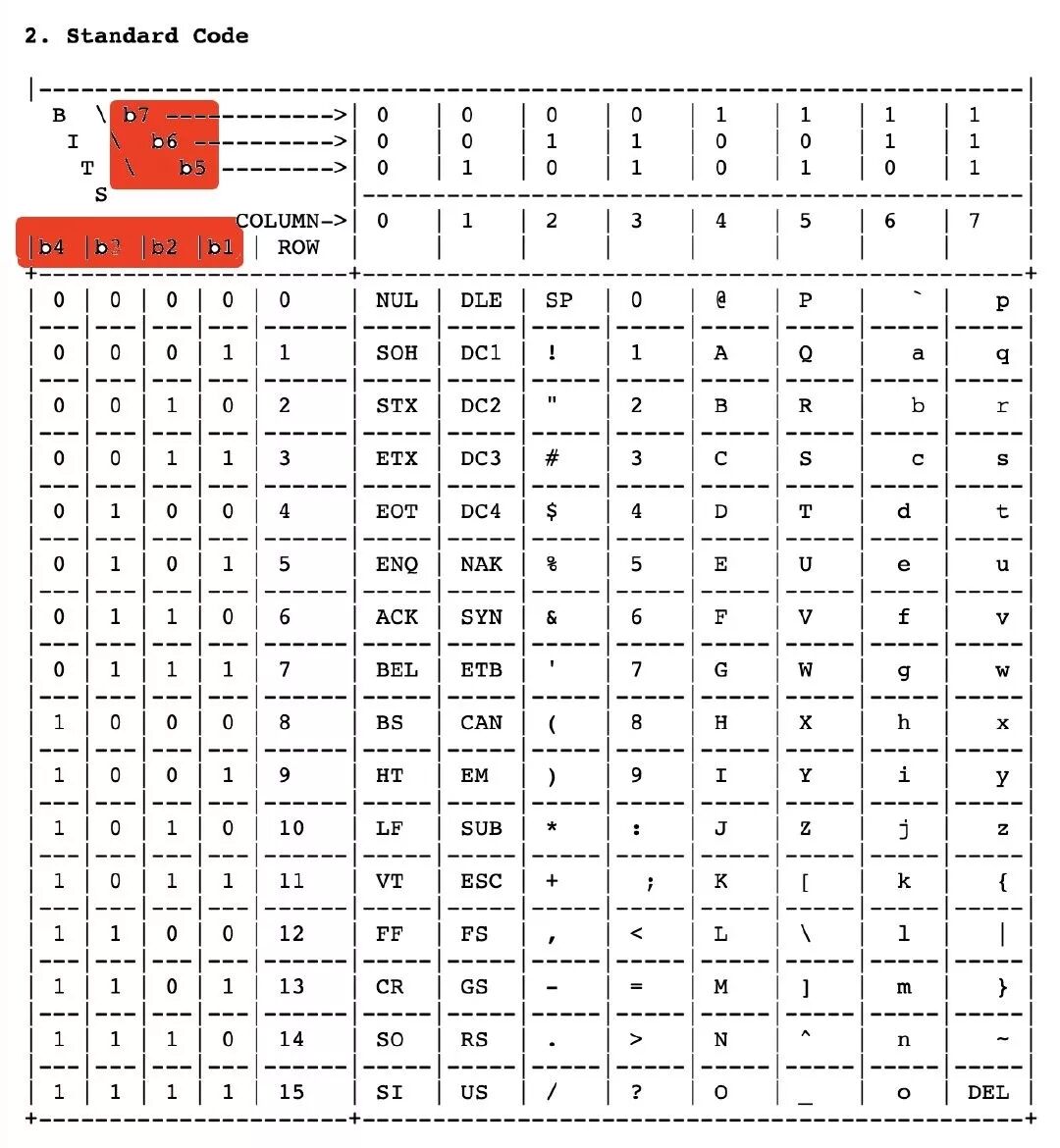 第 3 部分给出了该表的查阅方法以及二进制和字符的映射关系。原文提到,使用 7 位二进制数来映射字符。