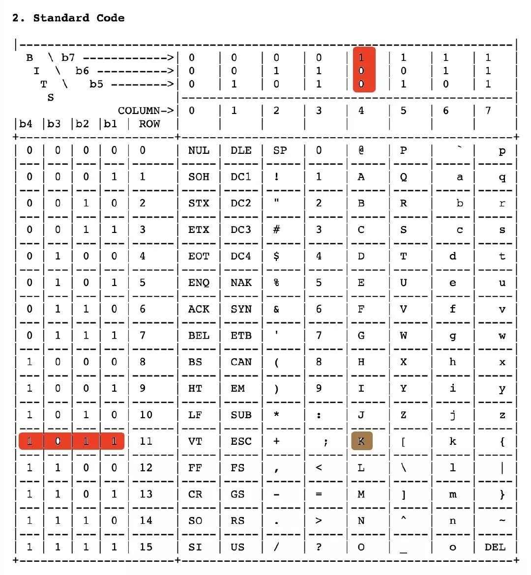 例如字符 的二进制表示由列号为 4 和行号为 11 的 7 个二进制数组成,即 100 1011。下图圈出了字符 K 的二进制表示: