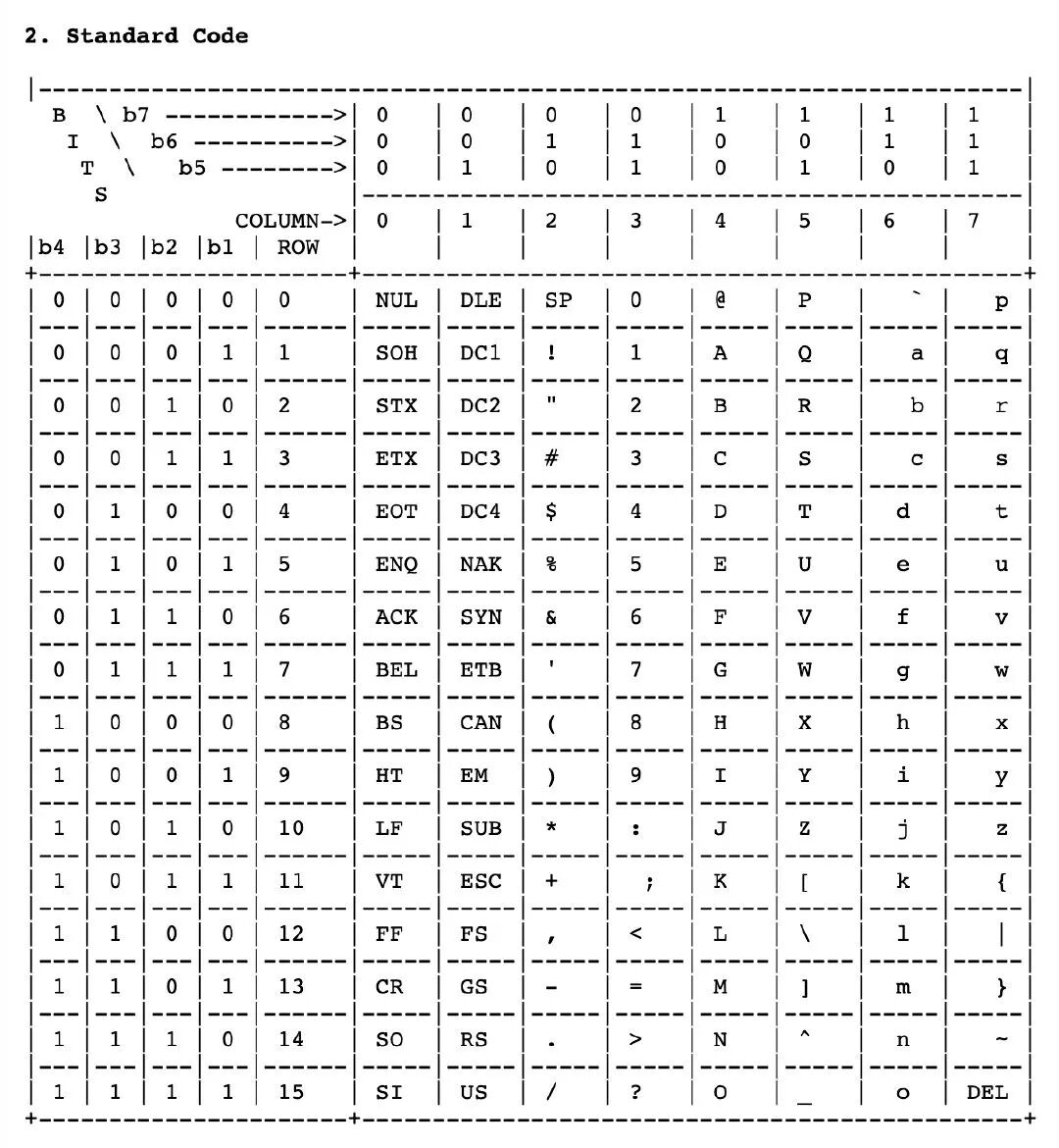 ASCII 的规范文档为 RFC20①,即关于 ASCII 的所有约定都写在 RFC20 文档中。RFC20 的制定时间为 1969 年 10 月 16 日,整个文档分为 6 个部分: