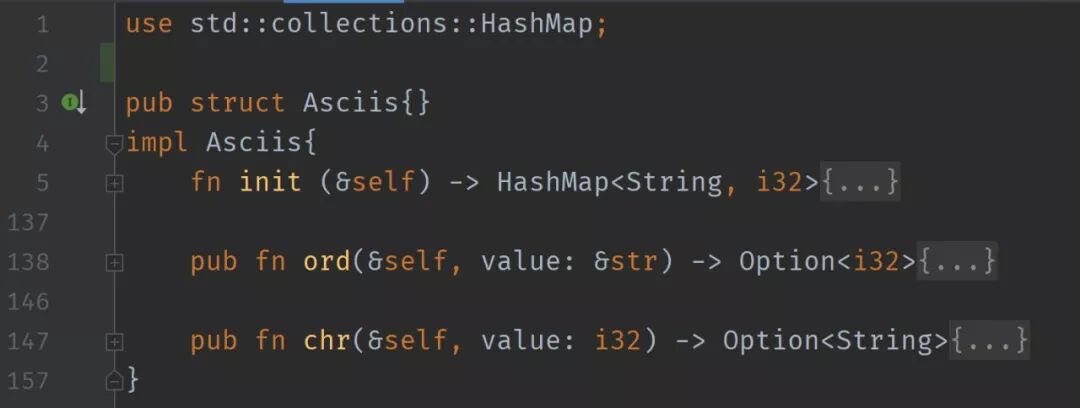 一个结构体,一个 impl 和定义的 init()、 ord()、chr() 方法。这与我们常见的形参、类和方法和概念相似。