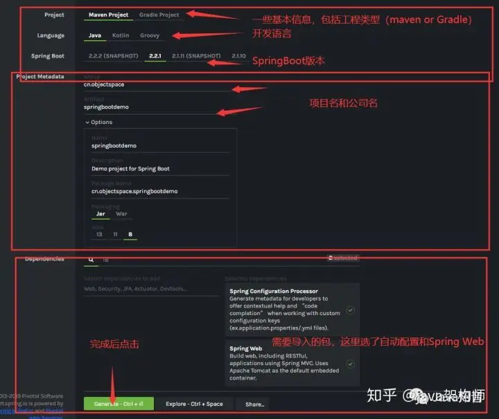 我们只需要在这个网页中把整个项目起好名字,然后选好我们需要的组件,就可以直接获得一个可以跑起来的SpringBoot项目。
