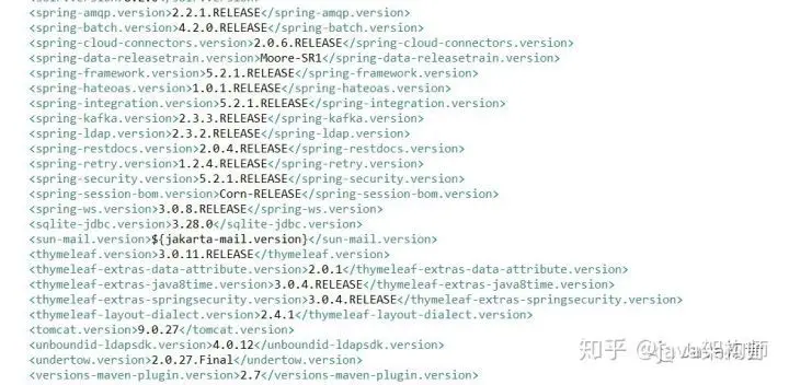 于是再点进去,可以发现里面放了很多的依赖和依赖的版本号。由于这个文件实在太长了,所以这里只展示一部分。