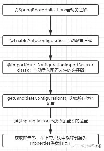 当我们的SpringBoot项目启动的时候,会先导入AutoConfigurationImportSelector,这个类会帮我们选择所有候选的配置,我们需要导入的配置都是SpringBoot帮我们写好的一个一个的配置类,那么这些配置类的位置,存在与META-INF/spring.factories文件中,通过这个文件,Spring可以找到这些配置类的位置,于是去加载其中的配置。