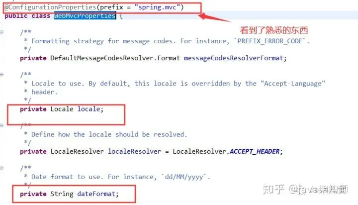 我们在yml中配置的date-format,就可以通过@ConfigurationProperties映射到类中的dateFormat中,然后在通过自动配置类,将这些属性配置到配置类中。