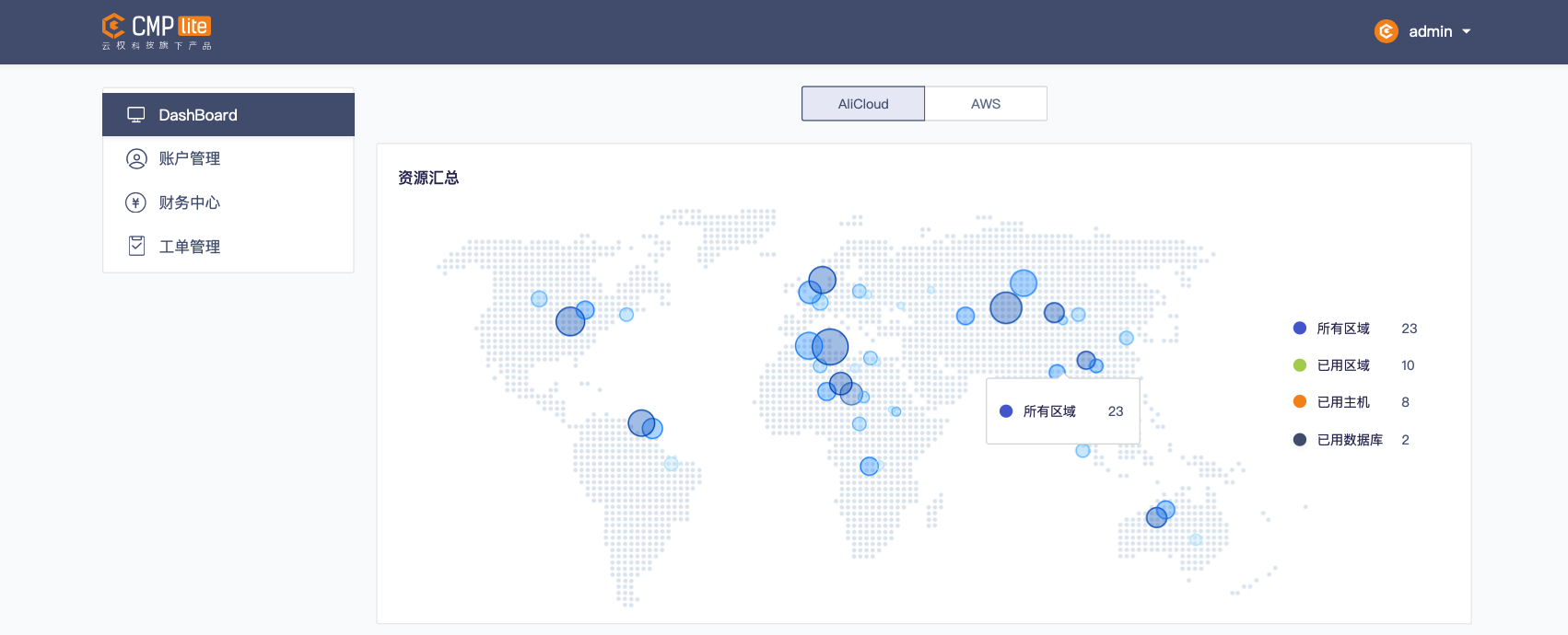 百度cmplite进行注册、登录并纳管阿里云、AWS等云服务商账号,可对已购买各云服务商的主机资源进行统一可视化监控,资源汇总界面清晰展现,从资源所在区域、已用区域、已用主机和已用数据库等维度对云资源进行概览。