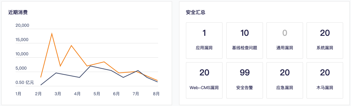 通过近期消费情况可对组织财务情况进行统一监控与分析,安全汇总版块涵盖了用户最基本对安全方面的需求,如:系统漏洞、安全告警、应急漏洞和应用漏洞等。