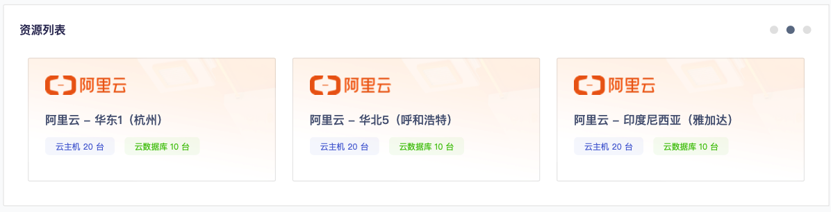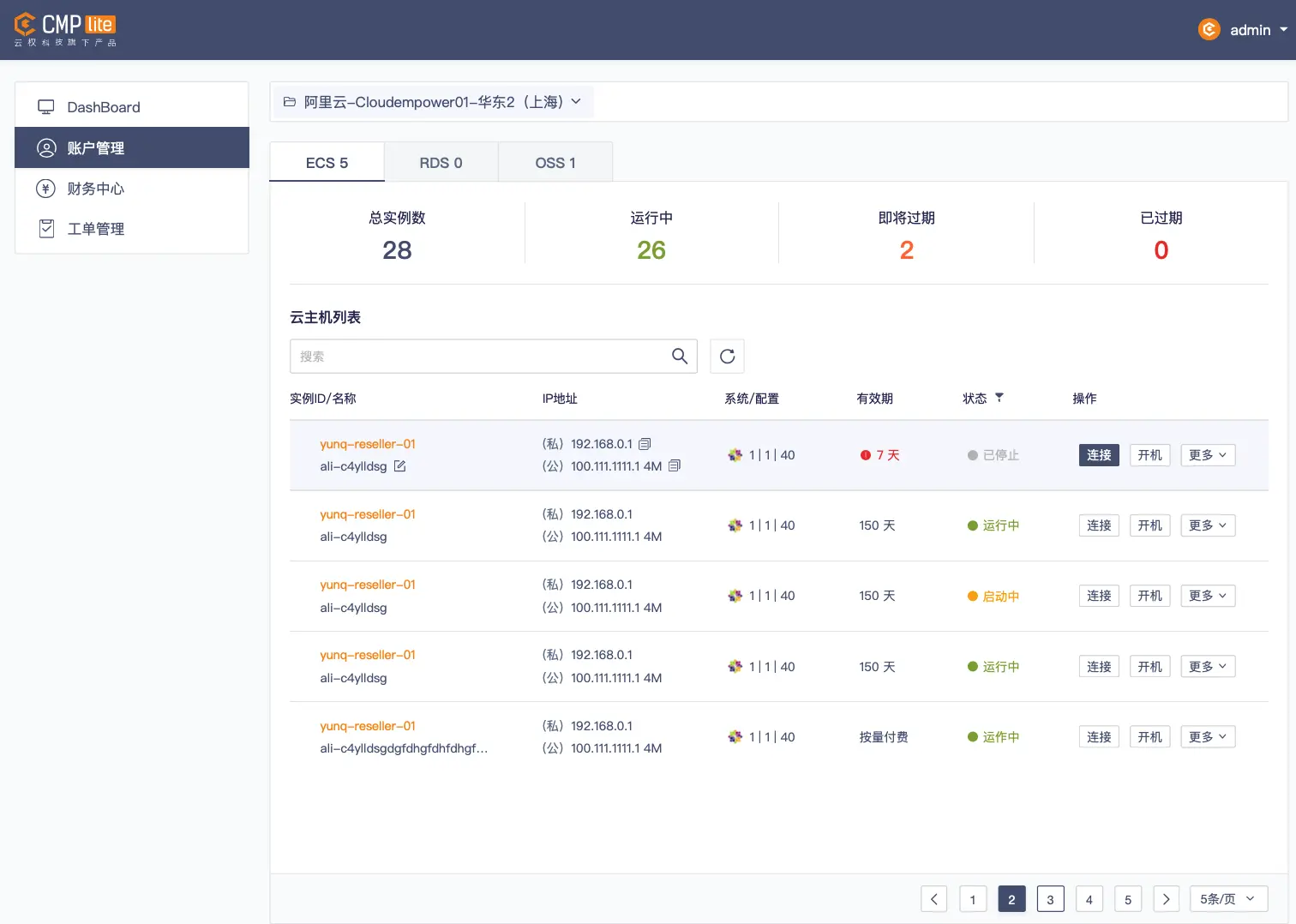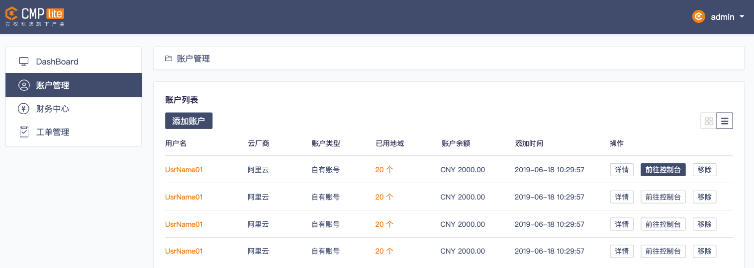 用户可通过账户列表中的账号管理界面,一览已购各云厂商的各区域账号资源使用情况。