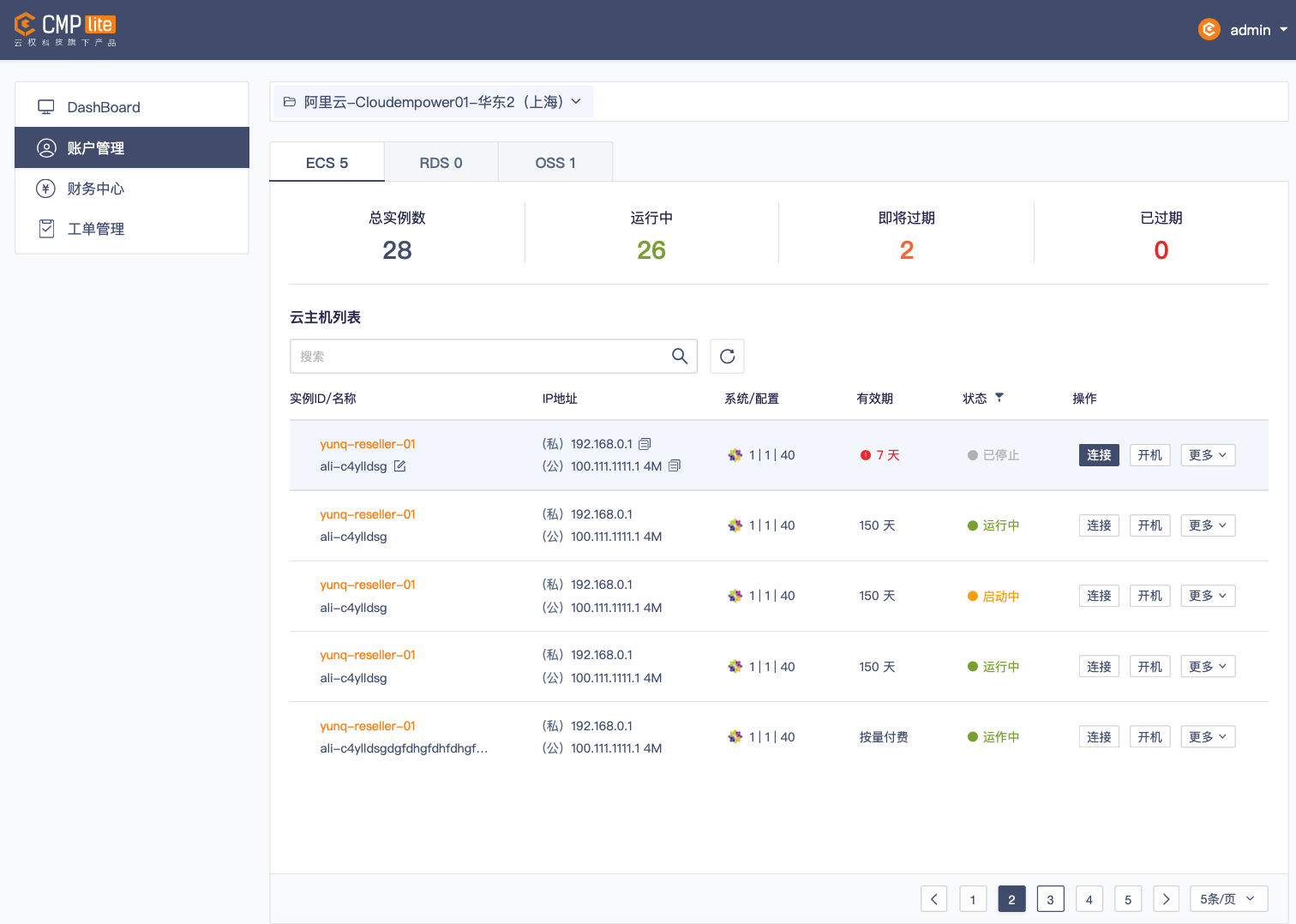 通过单个页面对资源进行汇总,如总实例数、运行中、ID名称、IP地址和有效期等;一个好用、易用和够用的操作界面同时可对实例进行连接、开机、重启和重置密码等操作。