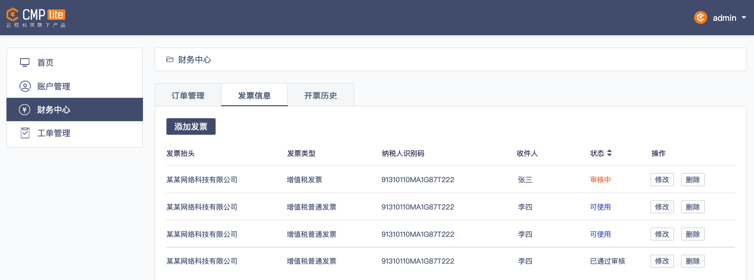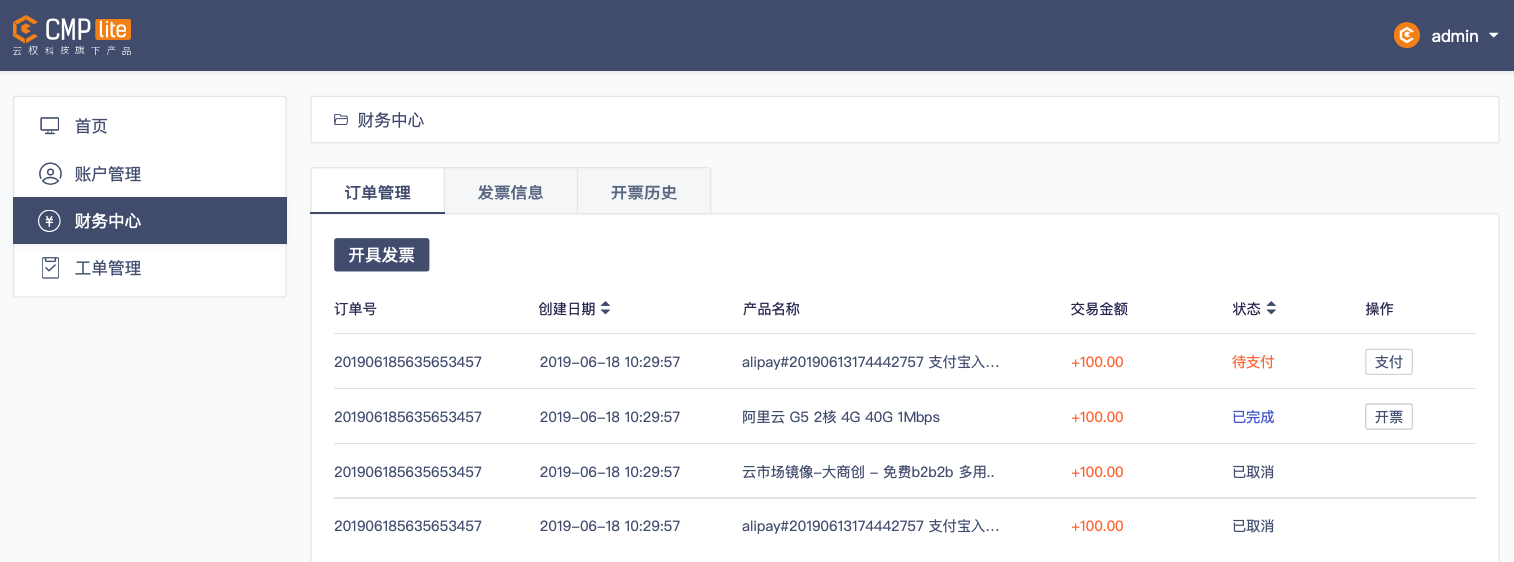 可对过往订单的日期、交易金额及状态进行可视化管理并进行批量操作,提高IT运维效率;便捷的发票管理同样大大提高用户和MSP在财务端的工作效率从而优化IT运维工作流程,支持添加、修改和删除发票并统一管理和批量操作。