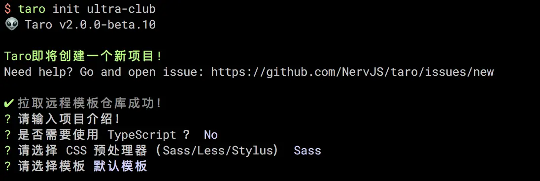 之后会出现一系列选项,按照下图所示进行选择即可(CSS 预处理器选择 Sass,模板选择“默认模板”,老司机可自行选择使用 TS):