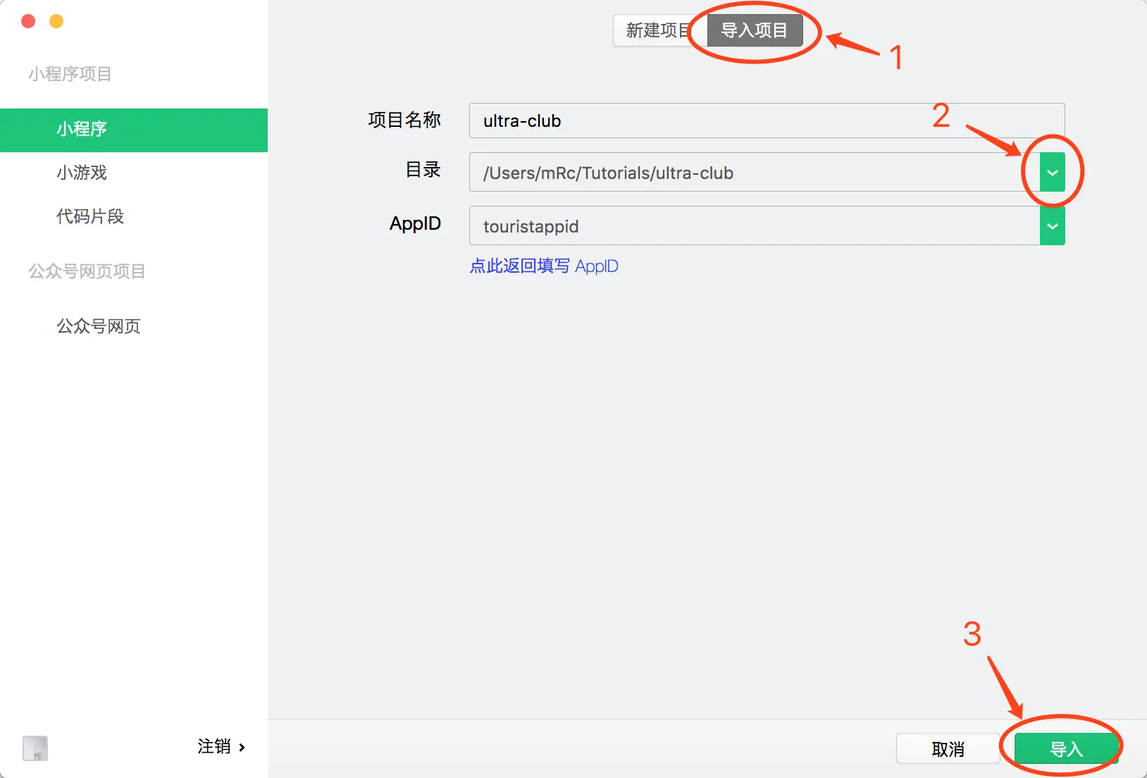 如上图所示,首先切换到”导入项目“一栏,然后点击”目录“输入栏右侧的按钮选择刚才创建的 ultra-club 文件夹,最后点击右下角的”导入“按钮即可。