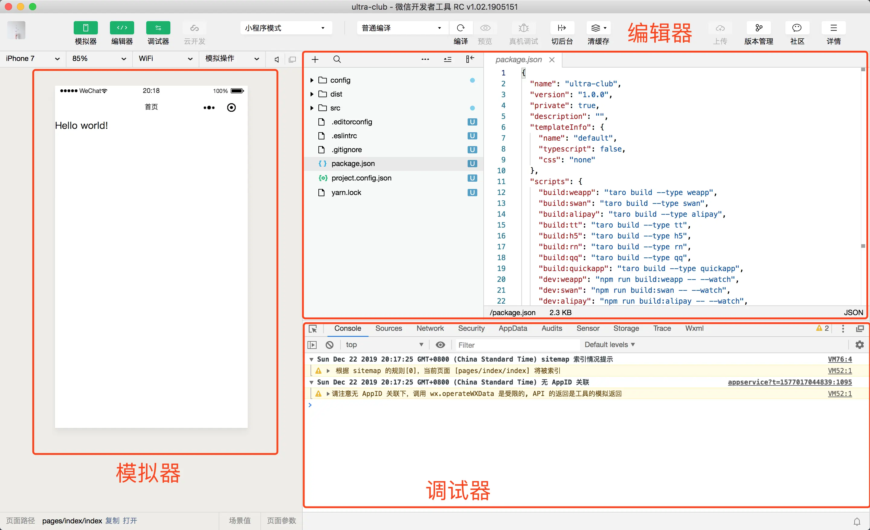 在模拟器页面中,看到了我们 index 页面渲染的 Hello world;编辑器能够查看所有代码,不过通常我们用自己习惯的代码编辑器来开发(VSCode 真香!);调试器则是类似 Chrome 的开发者工具。
