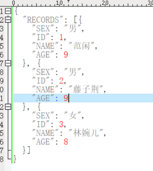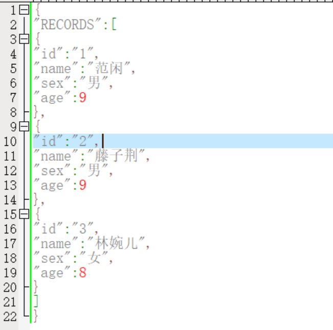 js文件如上图,3个对象,包含id、name、sex和age