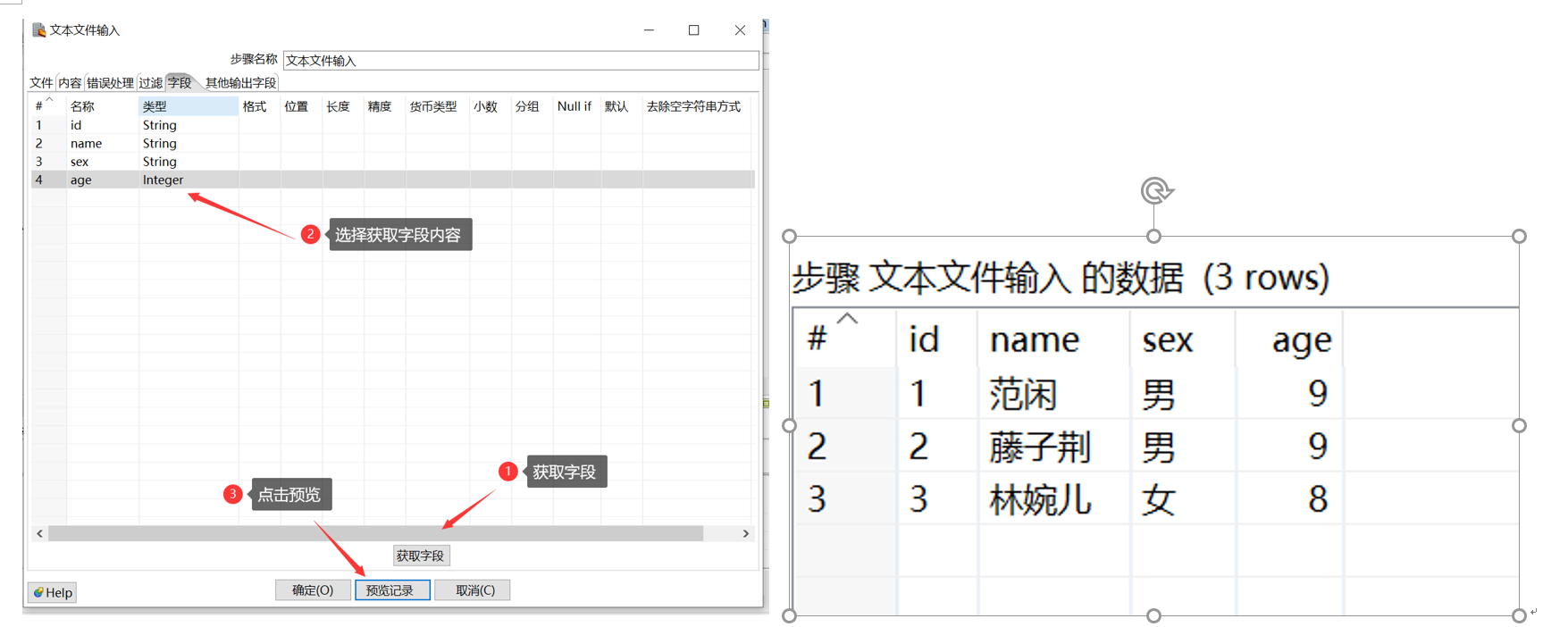 双击打开文本文件输入,如上图所示添加文件,选择字段后,点击确定即可导入txt数据,转换为具体的表数据流,点击预览可以看到转换后的具体数据,该数据可以写入文件或数据库表