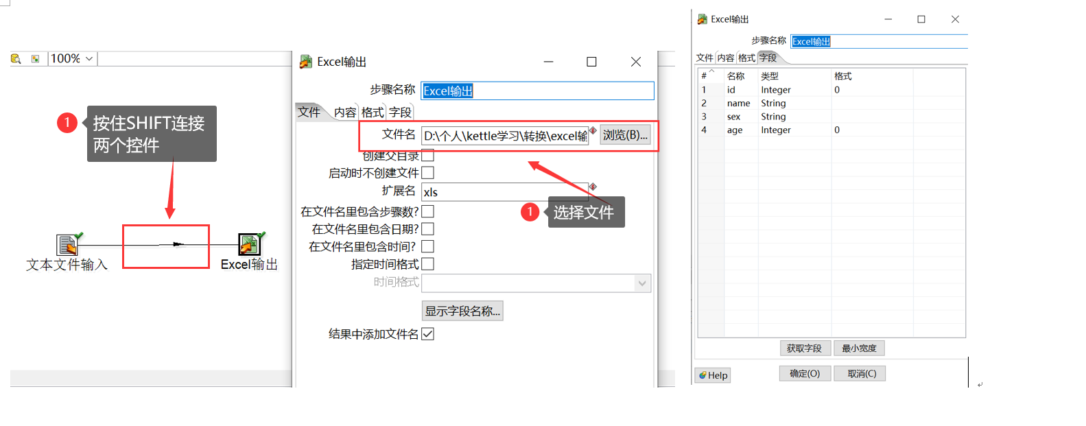 此处用到两个控件,文本文件前面说过,可以观看前面的内容。选择excel输出后,按住shift键,连接两个控件(HOP连线)。 双击打开EXCLEL输出,如上图所示添加文件,选择字段后,点击确定即可导出excel数据,Integer数据的格式要选择0,为整型,不然导出的id为1.00,带出的文件内容如下: