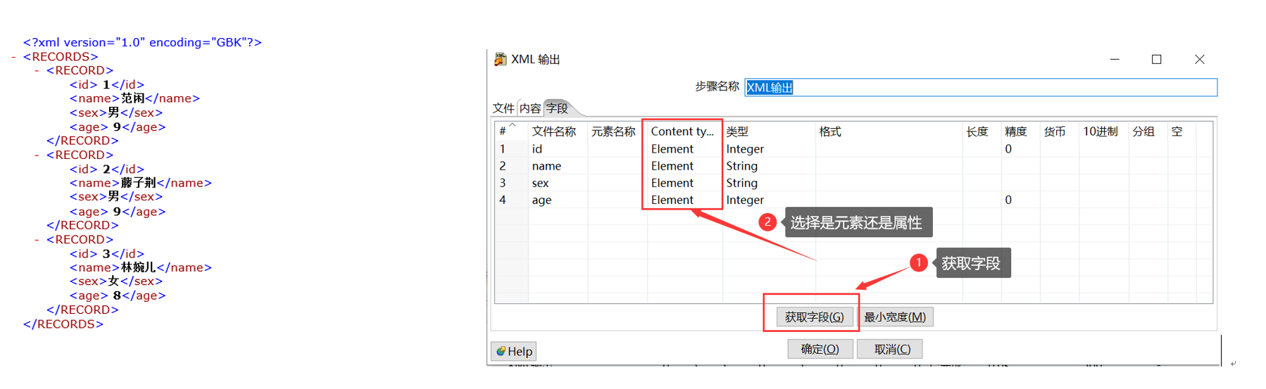 此处用到两个控件,文本文件前面说过,可以观看前面的内容。选择excel输出后,按住shift键,连接两个控件(HOP连线)。 双击打开XML文件输出,如上图所示添加文件,选择字段和该字段是元素还是属性后,点击确定即可导出XML,Integer数据的格式要选择0,为整型,不然导出的id为1.00