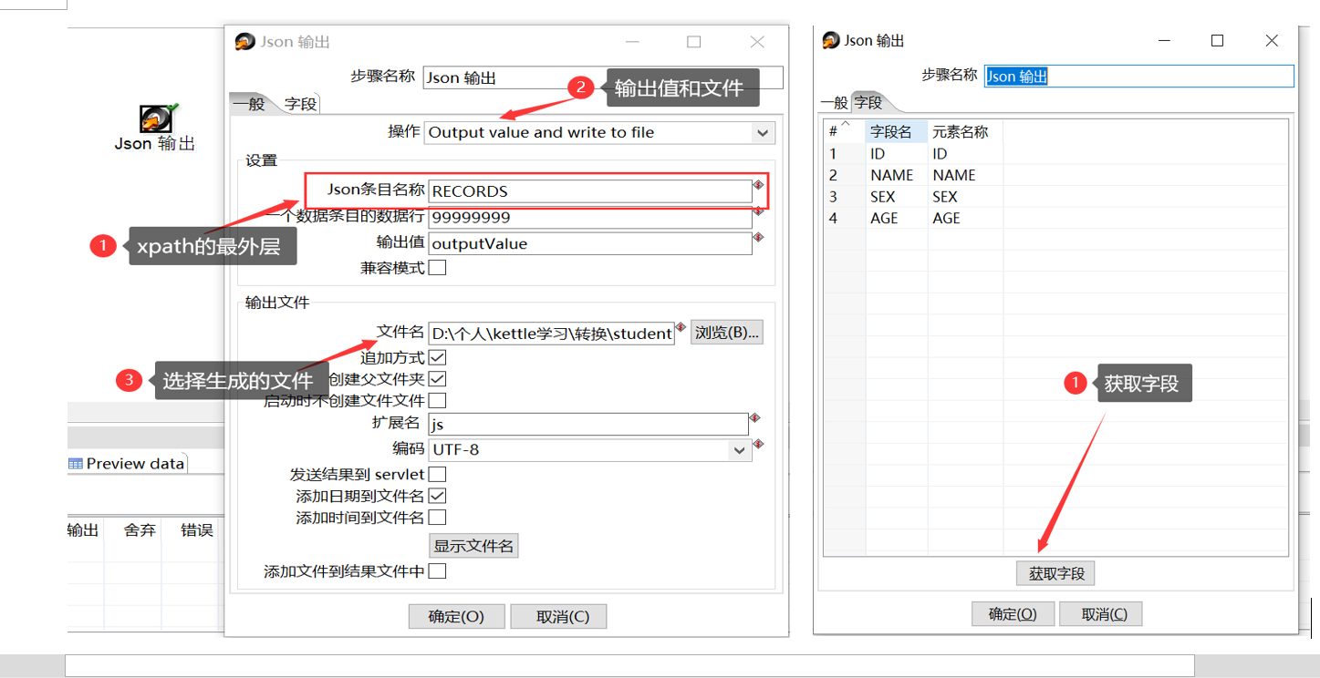 2.2、JSON文件输出:将数据流中的文件输出到XML中