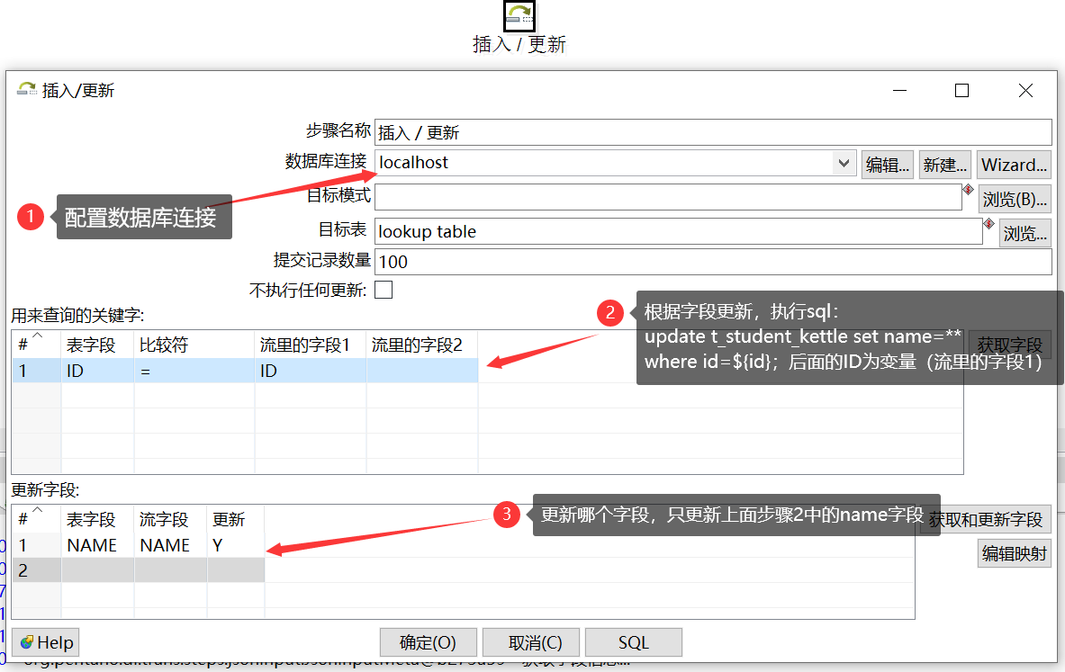 双击打开插入/更新,如上图所示配置好数据库,选择具体的表,按照1-3步骤配置,执行转换,即可插入/更新具体的数据库表。 **读取上个步骤的数据,放入数据流中,ID相同会执行更新操作,ID不存在会执行插入操作