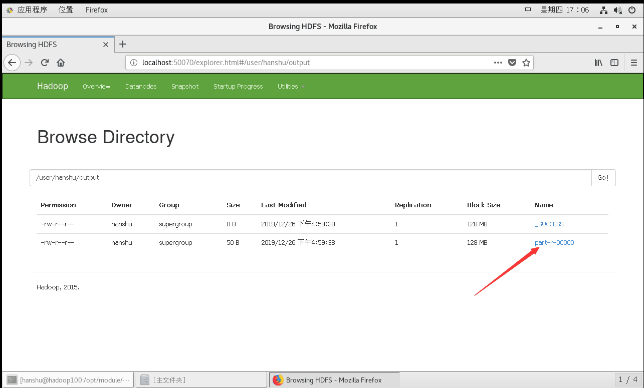 访问一下HDFS的在线web管理程序,看看output里面都有啥,发现只有两个文件,去掉那个_SUCCESS,结果自然就存在我们的part-r-00000文件里面了,当然也可以在网页端下载到本地,然后打开查看结果,还是用命令行吧。