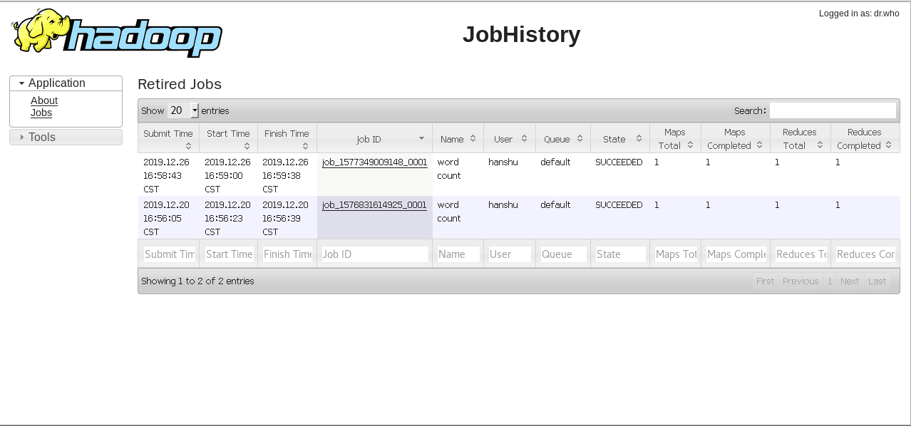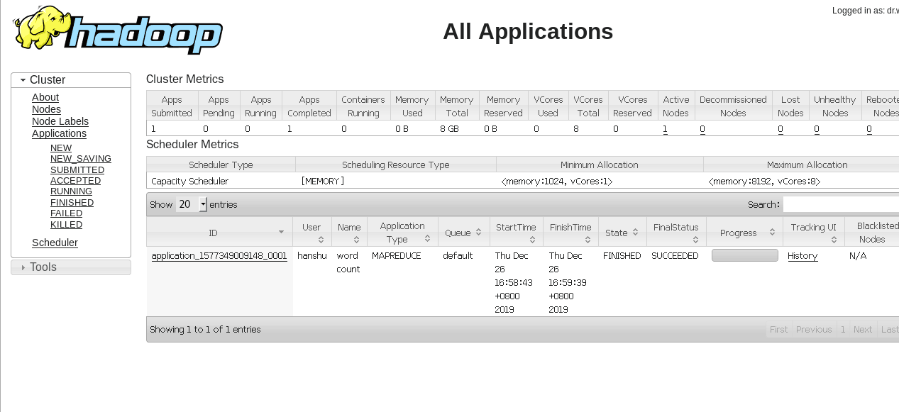 到这里真相就大白了,由于我们之前指定只要是MR程序,就要交给Yarn托管运行,Yarn负责资源的调度,由于之前我们配置了Yarn,自然我们这次运行的wordCount也会出现在Yarn web管理工具上面显示了。