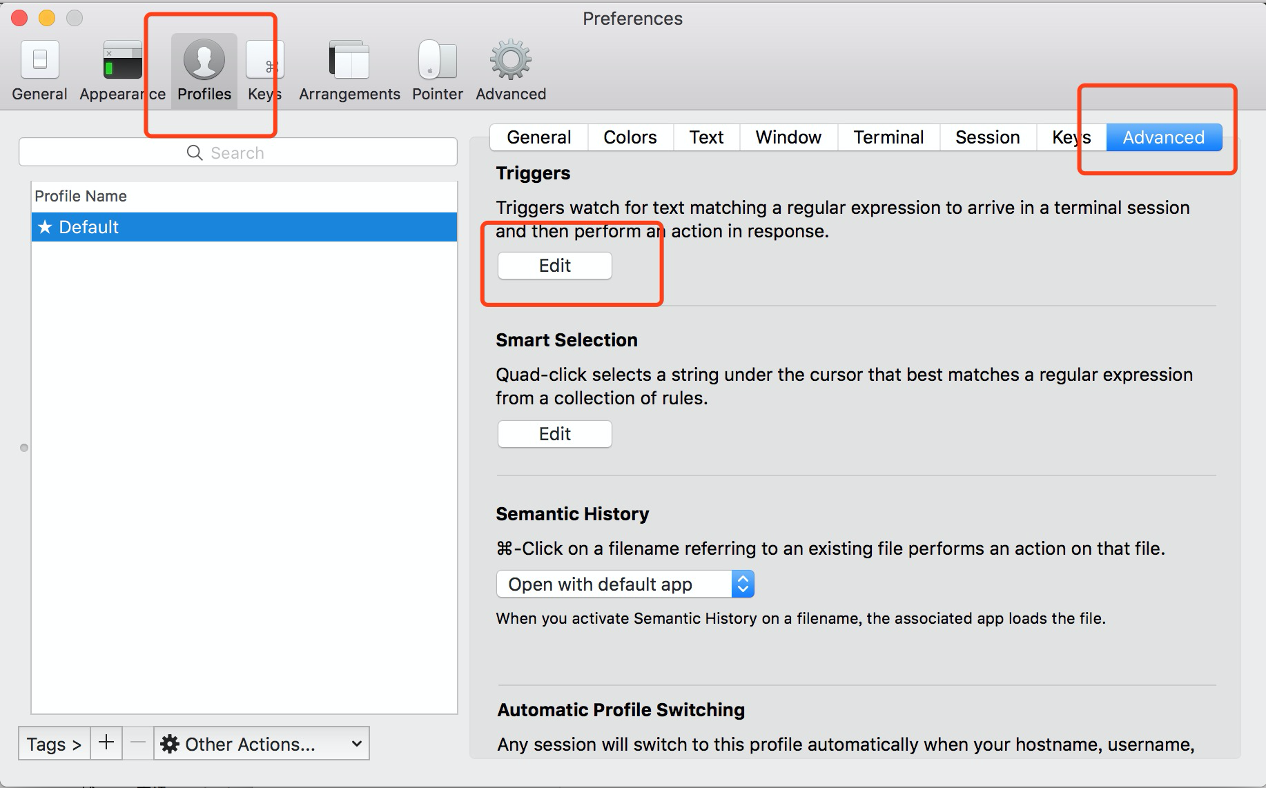 Regular expression: **B00000000000000 Action: Run Silent Coprocess Parameters: /usr/local/bin/iterm2-recv-zmodem.sh