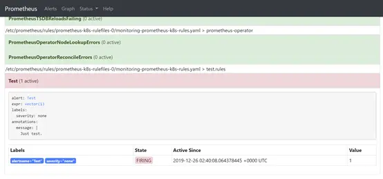 使用spec.groups.rules.alert即可定义告警规则。annotations.message是告警信息,expr是告警监控的表达式,我们可以使用PromQL结合各种exporter提供的方法来制定规则,这里我们制定一个始终存在的告警规则来用做演示。