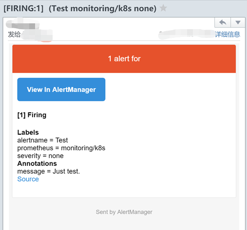 如果配置正确,我们会在group_wait时间后收到第一条邮件推送,如果告警有变动,会间隔group_interval设定的时间向组推送,并每间隔repeat_interval推送一次,直至解决。